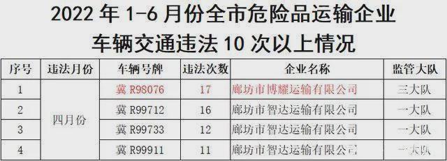 其中,廊坊市博耀运输有限公司车辆冀R98076单月违法17次竟然超越了今年上半年普货车辆单月“违法冠军”16次(请点击)。该企业2022年4月因为有5辆危险品车逾期未检验,被公安部列入高风险运输企业名单。