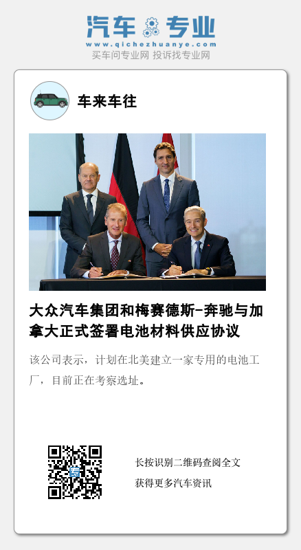 盖世汽车讯 据外媒报道,当地时间8月23日,梅赛德斯-奔驰集团和大众汽车集团与加拿大政府签署协议,以确保获得加拿大锂、钴、镍和石墨等关键电池材料的大量库存。目前,在向电动汽车转型的大趋势下,大众和奔驰正与其他汽车制造商争夺稀缺的原材料供应。