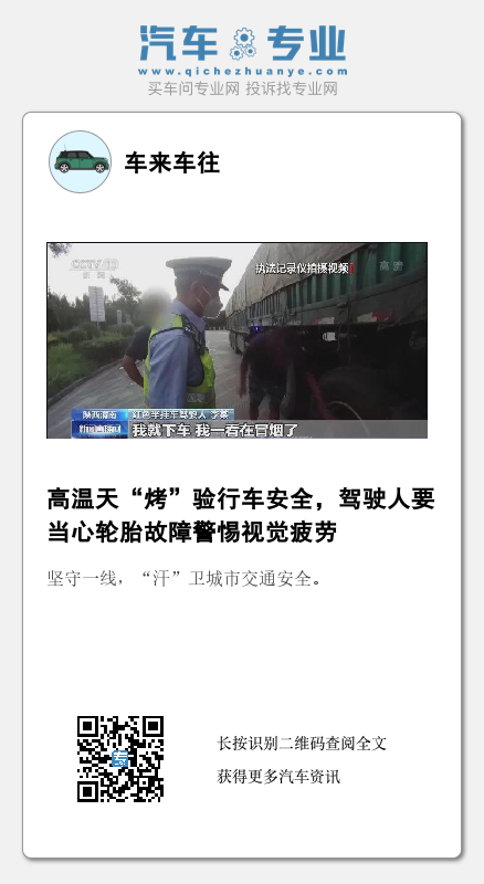 近日,我国多地正经受高温天气考验,交警提醒,驾驶人上路之前一定要对车辆的安全性能及时检查,尤其要关注轮胎状况。如果车辆在高速公路上发生故障或事故,要谨记车靠边、人撤离、即报警,以确保行车安全。