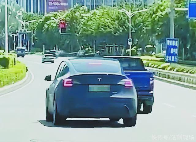相持一段后,新能源车超车往前行驶,皮卡车又跟了一段。(本组图/视频截图)