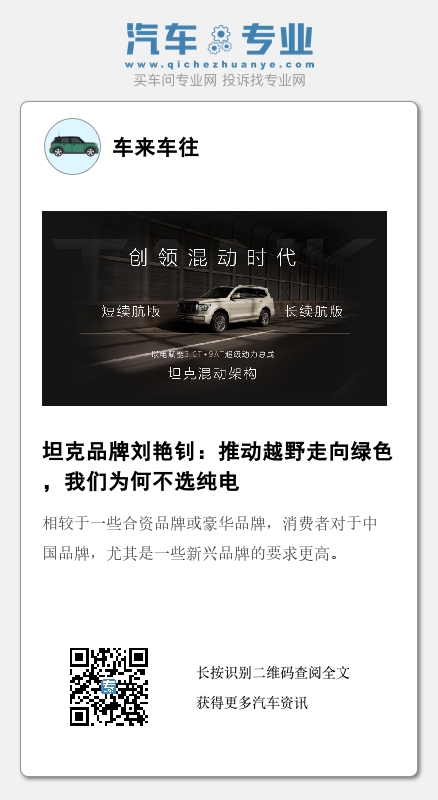据坦克品牌CEO刘艳钊介绍,坦克品牌在新能源路线上是经过大量评估之后做出的选择。在他看来,与其给用户提供一套性能严重缩水的纯电动越野车,不如在保证越野性能的同时借新能源来提升动力和经济性。