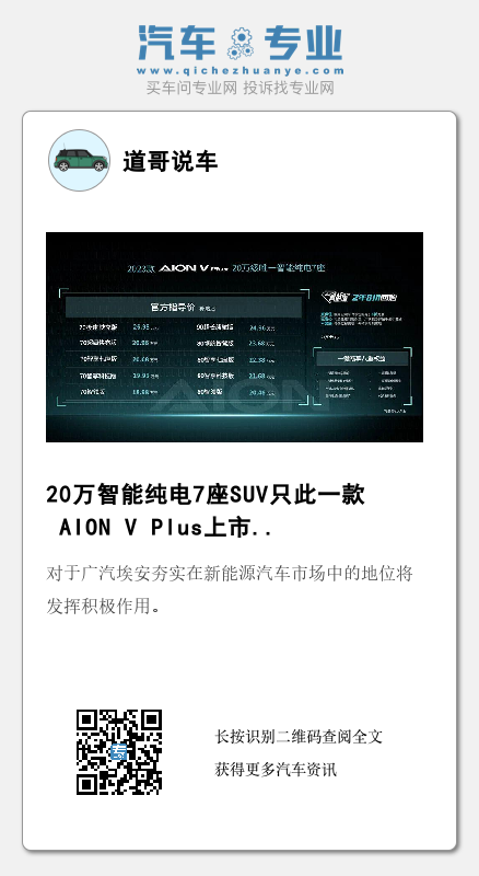 而就国内市场环境而言,家庭用车对7座车型的需求也比较旺盛,可以预见,随着AION V Plus 7座车型的上市,将为广汽埃安提供更高的销量贡献。对于广汽埃安夯实在新能源汽车市场中的地位将发挥积极作用。
