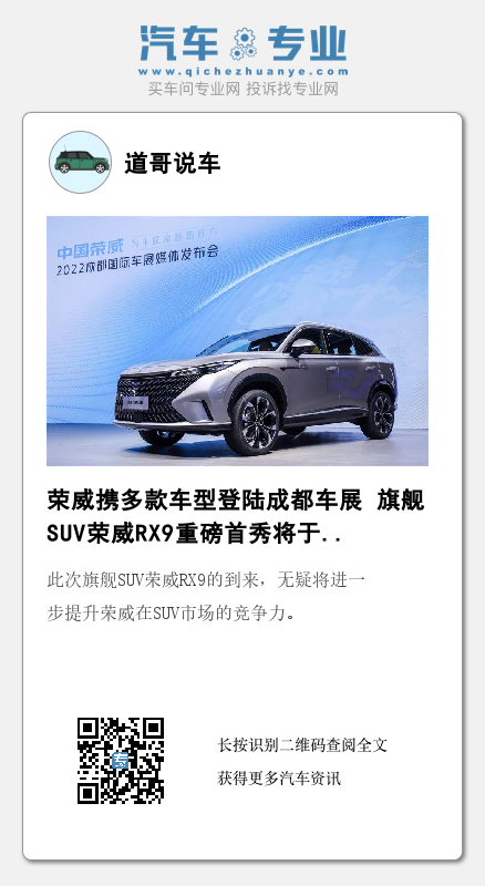 此次旗舰SUV荣威RX9的到来,无疑将进一步提升荣威在SUV市场的竞争力。未来,中国荣威将坚持“为中国家庭造好车”的理念,以科技为动力,以用户体验为导向,在上汽集团强大技术底座的赋能下,汇聚智能创新科技,不断推出满足中国家庭需求的精品车型,持续刷新用户的出行体验。