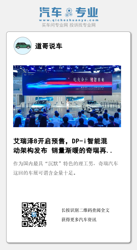 【文/道哥说车 听风吟】8月26日开幕的成都车展上,奇瑞汽车携多款重磅车型及全新品牌LOGO亮相,同时正式全球首发奇瑞新能源混动技术品牌——“DP-i智能混动架构”。就车型而言,艾瑞泽8毫无疑问是展台焦点,作为奇瑞汽车轿车序列中最高规格的车型,将带动奇瑞汽车轿车产品向上。