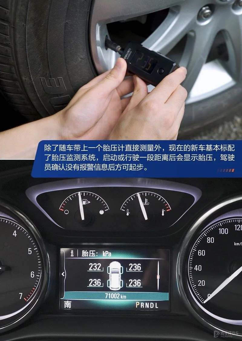 我们在检查4条轮胎时,可以顺便把轮胎表面的钉子、石头等异物挑出来,最好带上一个胎压计测量一下胎压是否处在合理范围;当然赶时间的话,对每个轮子来一脚“佛山无影脚”就心中有数了。