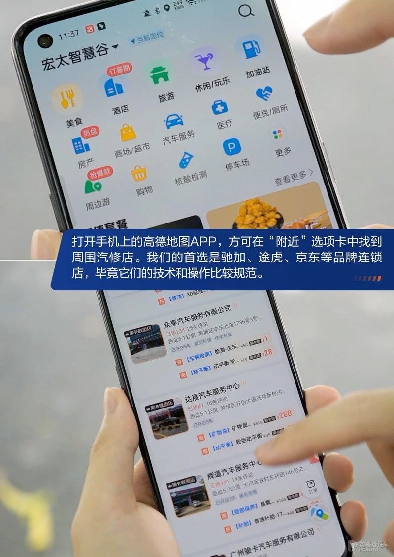 选择一家专业靠谱的轮胎店帮助我们换胎,可以事半功倍。我们打开高德地图,方可在“附近”选项卡中找到周围的汽修店。我们的首选当然是大品牌连锁的店面,比如驰加、途虎、京东等,他们的技术和操作都比较规范。