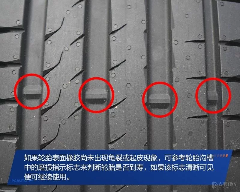 如果轮胎表面橡胶的已龟裂或起皮时,表示这条轮胎的保质期已到,建议更换;如果轮胎没有上述的异常,则建议参考轮胎沟槽中的磨损指示标志来更换,如果该标志清晰可见便可继续使用,反之则需要替换。