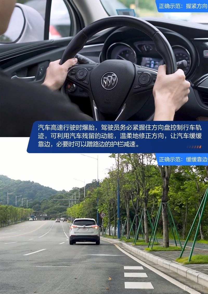我们在这里郑重提醒下大家,汽车高速行驶时爆胎,驾驶员务必紧握住方向盘控制行车轨迹,千万不能急打方向或重踩刹车,我们需要利用汽车残留的动能,温柔地利用刹车和方向盘修正方向,让汽车往应急车道上开,必要时可以蹭路边的护栏减速。