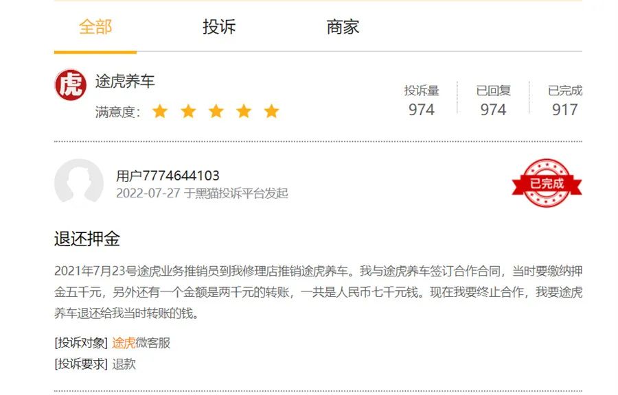 但事实上,途虎养车的口碑仍不算好,截至目前,关于途虎养车的投诉在黑猫投诉平台中已累计974条,其中不仅涉及用户还涉及到了加盟商。