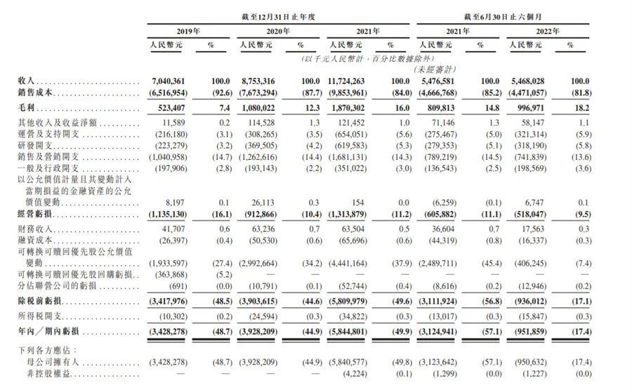 过去3年(2019年至2021年),途虎养车出现的亏损分别是34亿元、39亿元、58亿元,2022年上半年亏损了9.519亿元。也就是说,途虎养车在3年半的时间里累计亏损140.519亿元。而导致途虎养车连年亏损的原因,与其高昂的销售成本或许脱不开干系,申请书显示,2022年上半年,该公司的销售成本占到了营收的81.8%,这也导致其毛利率仅有18.2%。