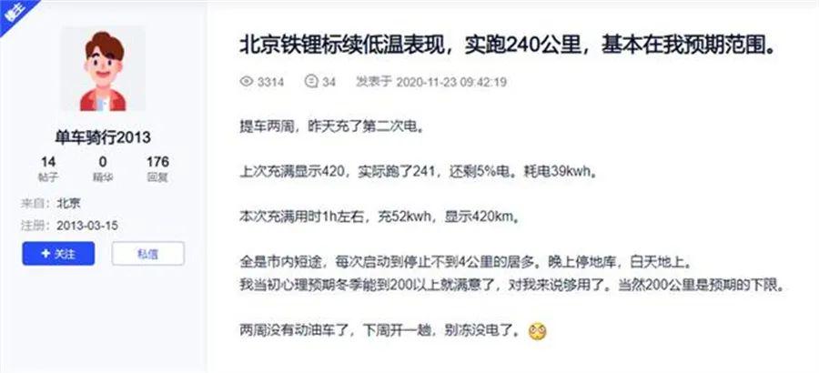 事实上,关于电动汽车续航打折的话题并不新鲜,特别是在冬季,问题突出尤为明显。而就车型来看,也不乏特斯拉Model 3和比亚迪汉这样的热门车型。2020年冬,就有磷酸铁锂版特斯拉Model 3车主发帖称,北京地区11月左右,车辆在市内短途行驶,实测续航是240公里,而这款车官方标称的NEDC续航是468公里。