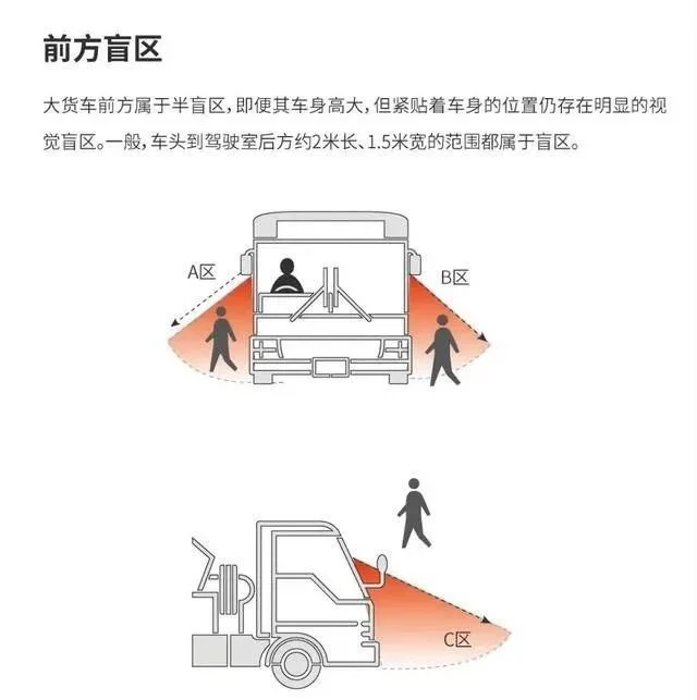 千万不能从它前方穿行,不要贴着车头通过,一定要让大车驾驶员看到你,所以请与车头始终保持2米以上的距离或从车后绕行。