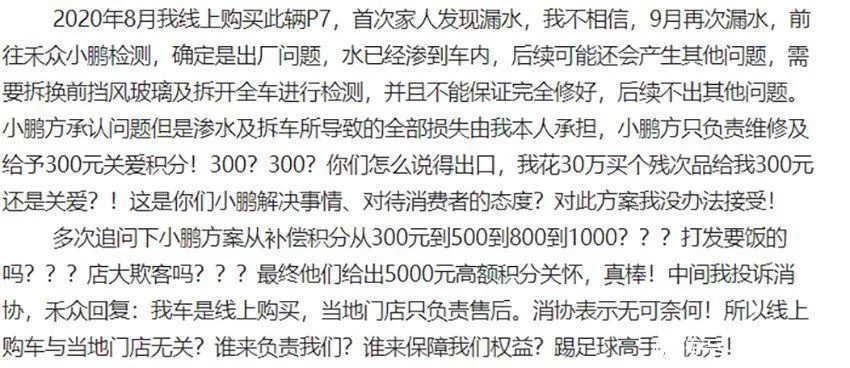 一般来说,一辆车龄为两年的车,正常都不会出现什么故障,不过凡事都会有例外。前几天,据“1818黄金眼”报道,在两年前,邱女士花费30多万元购买了一辆小鹏P7,买回来使用的这两年时间里车辆就接连出现车内漏雨、屏幕黑屏、副驾驶车门关不上的故障,让她难以接受,进而把自己的遭遇曝光出来寻求帮助。