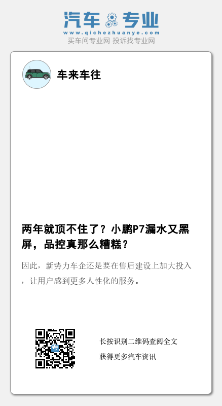 小鹏作为发展时间比较短的新势力厂商,在造车经验方面的积累尚处低位,距离传统合资品牌仍有所差距,所以在可靠性方面依然会存在问题,再加上新势力售后服务中心数量相对较少,所以爆出的问题也会多一些。因此,新势力车企还是要在售后建设上加大投入,让用户感到更多人性化的服务。