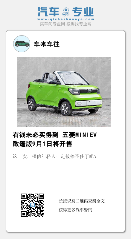 日前从官方获悉,为实现年轻人的敞篷梦,五菱汽车推出五菱宏光MINIEV敞篷版,并将于9月1日正式开抢。这里要划重点了:这台拉风的敞篷小车,可不是说买就买的哦,要抽签,具体下订的渠道就是官方的APP、小程序等地方。