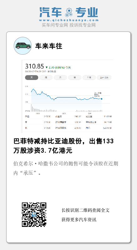 伯克希尔·哈撒韦公司在提交给香港证券交易所的一份文件中表示,已减持133万股比亚迪在香港上市的股票,出售价格约3.7亿港元(合4,700万美元),其在比亚迪已发行H股中的持股比例也从20.49%降至19.92%。