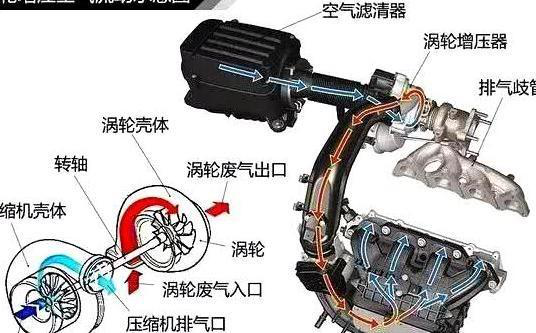 其实自然吸气发动机和涡轮增压发动机之间的区别在于一套涡轮增压器来压缩空气,和自然吸气相比,涡轮增压气缸内大气压力要大出不少,气缸单位容积内的含氧量更高,就能燃烧更多的汽油,爆发更多的能量,这也是为什么涡轮增压拥有如此强爆发力的主要原因。
