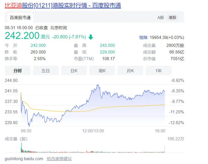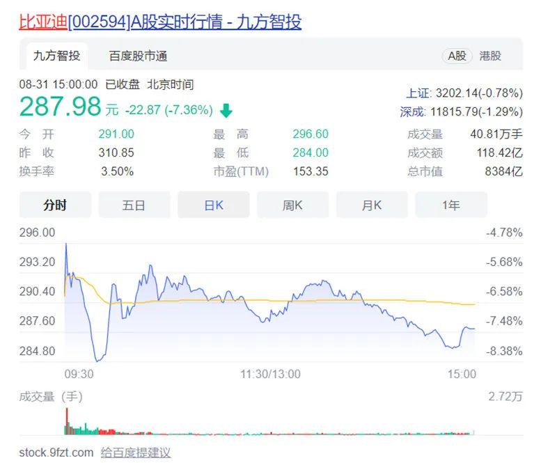 8月31日,比亚迪A/H股应声大幅下跌。其中,比亚迪A股盘中最高跌超8%至284元,最终当日收跌7.36%至287.98元,总市值缩水近666亿元。而比亚迪港股盘中更是最高跌了13%至229元。