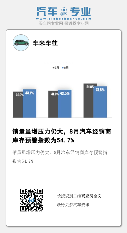 8月31日,中国汽车流通协会发布的最新一期“中国汽车经销商库存预警指数调查”显示, 8月汽车经销商库存预警指数为54.7%,同比上升3.0%,环比上升0.3%。