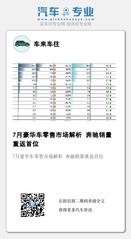 7月,豪华品牌经销商零售29.3万辆,环比下滑21.1%,同比增长6.4%,这是13个月以来,继6月销量正增长之后,第二个月销量正增长。7月豪华品牌及新势力高端新能源车销量为4.5万辆,环比下滑61%,同比增长27%,其中纯电车型销售2.8万辆,环比下滑71%,同比增长32%;7月新能源销量下滑,因特斯拉上海工厂检修升级,停产两周,7月特斯拉销量仅为8930辆,环比下滑88%。豪华车市场1-7月累计销量,奔驰品牌以43.4万辆重返首位,较宝马多3480辆。