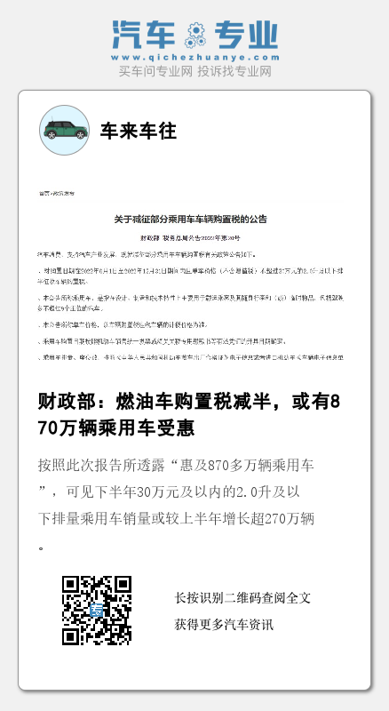 随后,于5月31日,财政部税务总局发布《关于减征部分乘用车车辆购置税的公告》(以下简称“公告”)。