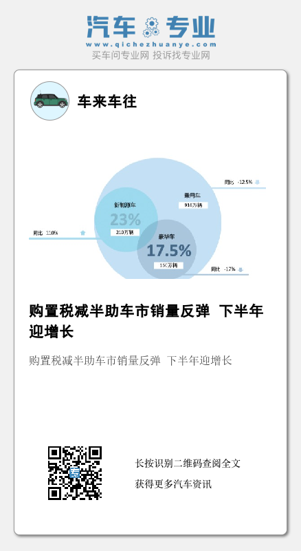 国家出台购置税减半措施,符合政策的有12个豪华品牌49款车型(注:部分品牌高配车型不享受购置税减半政策,但也计入了整体数据中),6月这部分受益车型销量为17.7万辆,环比增长47%;其中奥迪这部分车型销量最多,奥迪Q5(参数丨图片)在成交价格方面比奔驰GLC、X3(配置 6月,路虎品牌新车成交均价为76万,对比去年同期增加10万元,与去年同期比较,路虎高价值车型销售比例有所增长;路虎品牌折扣维持在13%左右。