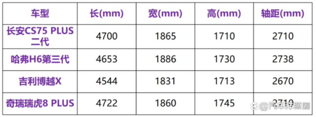长度上比哈弗H6短了100多毫米,比长安CS75 PLUS短了150多毫米,轴距上也是几款竞品里最短的。