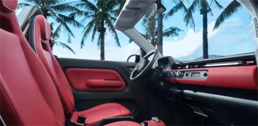 但该款车型在配置上却不再简陋,配备主副驾双安全气囊,拥有彩色液晶组合仪表、主副驾遮阳板化妆镜、冷暖空调,前舱多达10处储物空间,行李舱容积180L。舒适性方面,五菱宏光MINIEV敞篷版提供坡道辅助、倒车影像,还可通过LING Club App实时监测车辆状态,支持远程寻车、智能开关车门、爱车体检、预约充电、智能补电等多种功能。