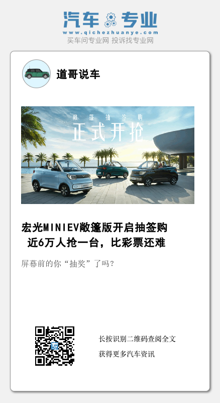 值得一提的是,“中奖”宏光MINIIEV敞篷版购车资格的几率不高,《道哥说车》参与抽签购结果显示,截止9月1日下午17点许,成功率仅有1/57672,这一成功率甚至比买彩票中奖更难。