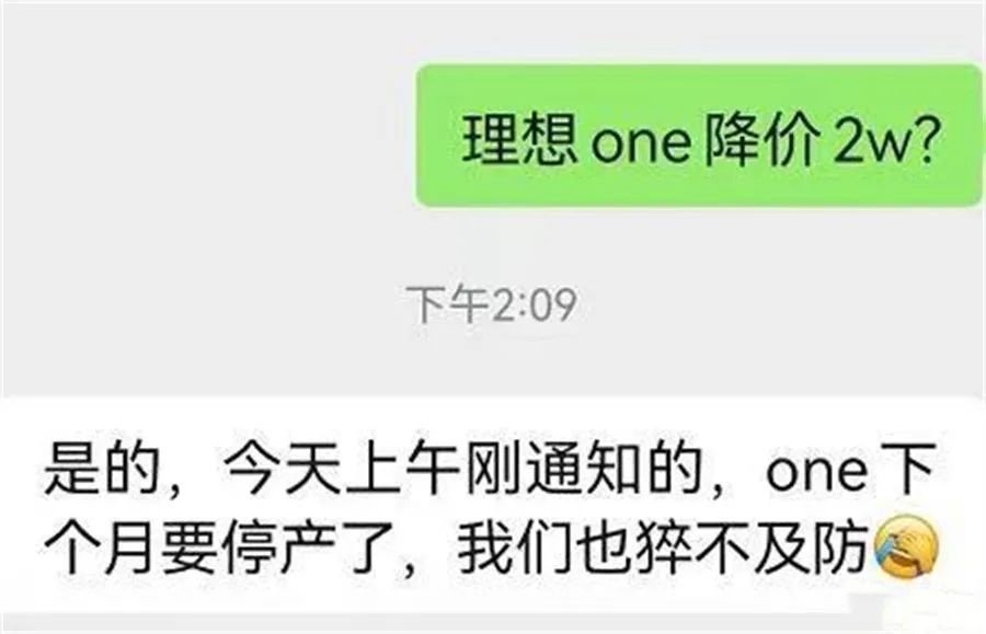 日前,一段网络曝光的聊天图片显示,疑似理想汽车的销售人员确认理想One近期降价2万元销售,并将于下个月停产。结合8月份李想所称的“等L8的就别买One了”来看,这有可能是理想ONE清库存,为即将上市的L8车型“让路”的信号。