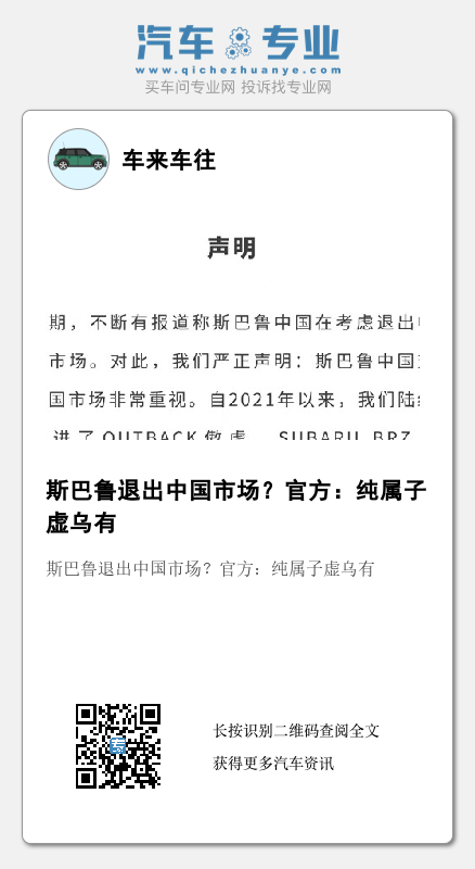 针对近期不断有报道称斯巴鲁中国在考虑退出中国市场这一消息,斯巴鲁中国日前给出官方回应:斯巴鲁中国对中国市场非常重视。自2021年以来,我们陆续引进了OUTBACK傲虎、SUBARU BRZ、FORESTER森林人等换代及改款车型,同时也将引进纯电动SUV车型SOLTERRA。未来我们也会致力将更多富有魅力的车型引入,以满足中国消费者的需求。