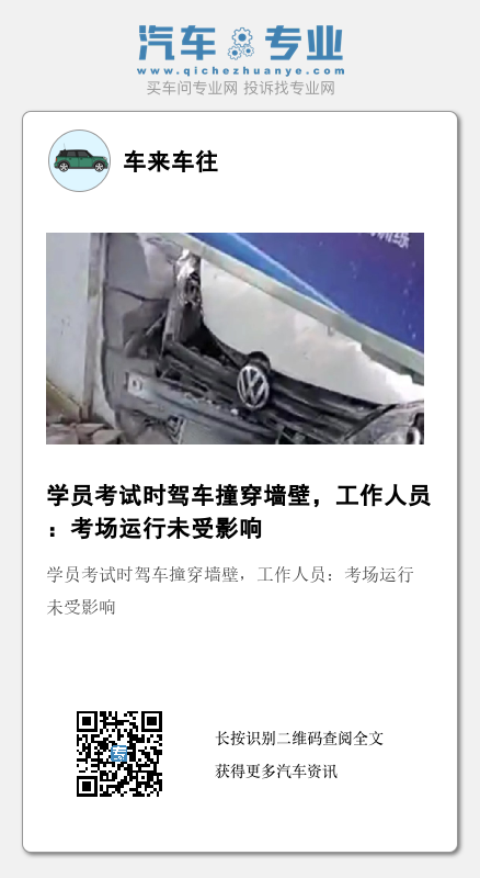 现场视频显示,一堵墙被撞出了一个大窟窿,墙上挂着驾考考试的相关信息,墙内地面上散落着大大小小的砖块,一辆白色考试车车头受损严重。