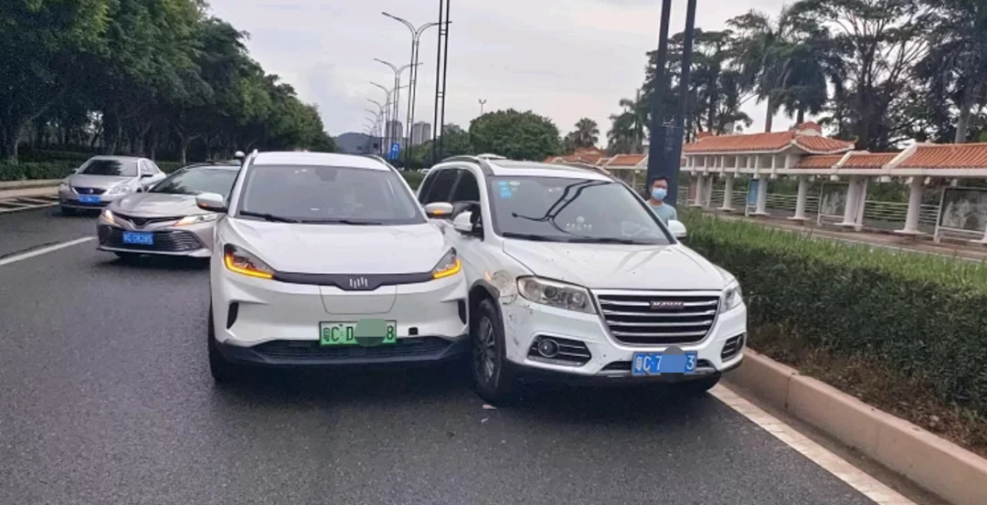 哈弗小车被撞后,向前滑动,车辆失控进入最左侧车道,还剐蹭了另一辆白色小车。▼