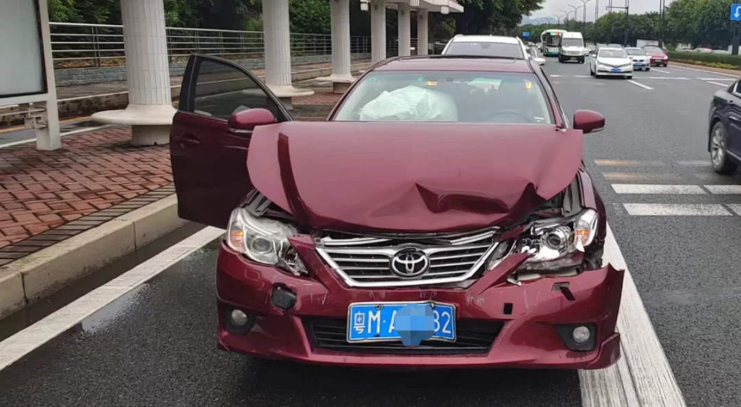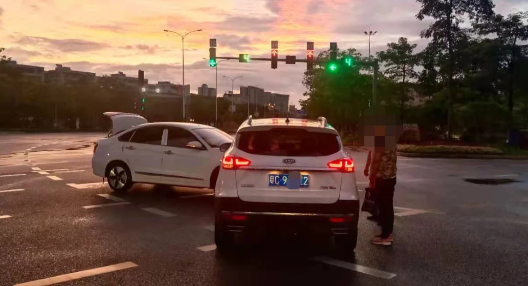 车流中,钟某驾驶粤MA××82号小车由西往东方向行驶。前方路口绿灯亮起,车流往前移动,钟某也跟着踩下油门。但没走多远,前方小车亮起了刹车灯,此时钟某跟车距离过近,雨天地滑更是刹不住车,竟直直撞上前方的粤C7××93号哈弗小车车尾。▼