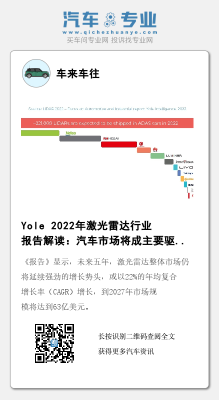 日前,全球知名市场研究与战略咨询公司Yole Group旗下的Yole Intelligence发布了《2022 年汽车与工业领域激光雷达应用报告》(以下简称为《报告》)。《报告》显示,未来五年,激光雷达整体市场仍将延续强劲的增长势头,或以22%的年均复合增长率(CAGR)增长,到2027年市场规模将达到63亿美元。