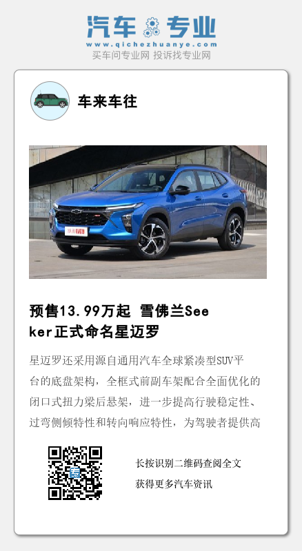 今日,上汽通用汽车雪佛兰品牌宣布,旗下全新紧凑型SUV--雪佛兰Seeker正式命名为“星迈罗”,并同步开启预售,预售价格为13.99万起。新车采用雪佛兰新一代设计语言,外观与内饰设计焕然一新,搭载新一代运动数字科技座舱,配备双10.25吋悬浮式双联屏,展现雪佛兰品牌特有的运动、年轻与活力。动力方面,搭载通用汽车第八代Ecotec 1.5T四缸直喷涡轮增压发动机和CVT智能无级变速箱。
