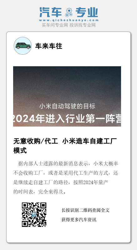 编辑观点:因小米董事长雷军已经声称不会再对外回应关于小米汽车的信息,有关于造车的消息仅会在官方渠道发布,因此无法获得小米对以上消息的评论是否真实。不过,结合此前小米造车的规划,2021年11月小米汽车总部基地落户亦庄,并分两期建设累计年产量达30万辆的整车工厂,一期和二期产能分别为15万辆,这也与小米汽车将自建工厂的模式吻合,关于小米造车的最新消息爱卡汽车也将会持续关注。