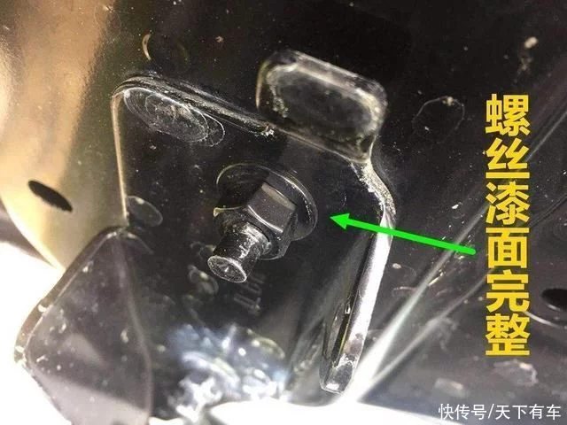 这个位置螺丝的作用基本上就是固定引擎盖,一般的维修保养是不会动到这部分螺丝的,除非是发动机引擎出故障难以继续使用或者发生重大交通事故受到过巨大冲击,引擎已经报废了才会需要扭动螺丝卸下引擎盖更换。所以如果这部分的螺丝被拧动过,一定不是前车主心血来潮想换个引擎盖玩一下那么简单。