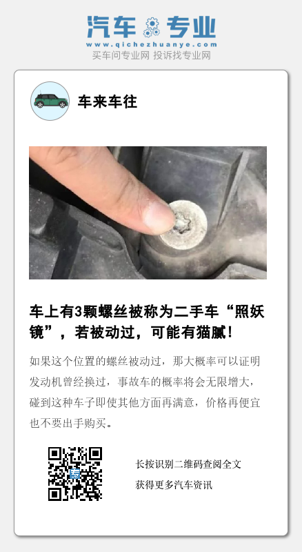 如果这个位置的螺丝被动过,那大概率可以证明发动机曾经换过,事故车的概率将会无限增大,碰到这种车子即使其他方面再满意,价格再便宜也不要出手购买。