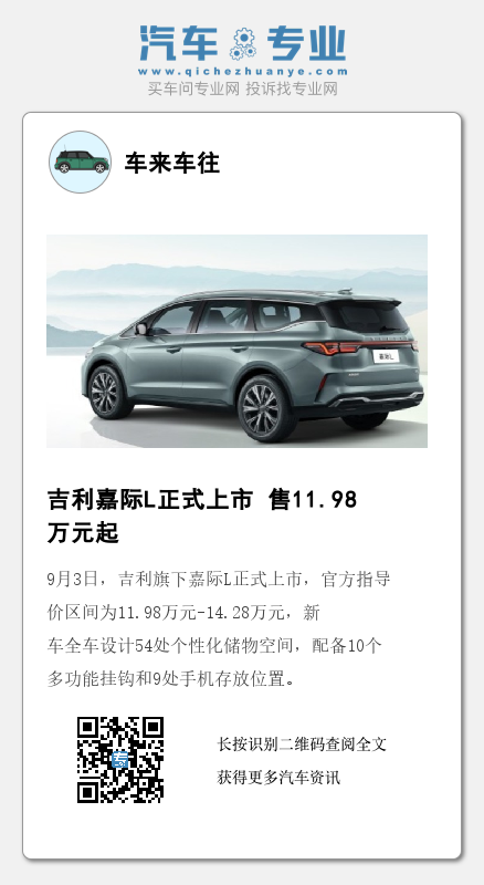 9月3日,吉利旗下嘉际L正式上市,共推出3款车型,官方指导价区间为11.98万元-14.28万元。新车外观采用全新设计语言,同时增加了“晓山青”车身配色。动力方面,吉利嘉际L搭载一台1.5T涡轮增压发动机。