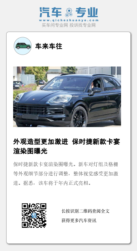据了解,保时捷新款卡宴内部将配备全新的全液晶仪表及中控屏幕,并将对底盘及悬架系统进行重新调校,进一步提升其动态表现。动力方面,新车将继续提供包含2.9T V6和4.0T V8及插电式混合动力系统在内的多种动力组合可选。