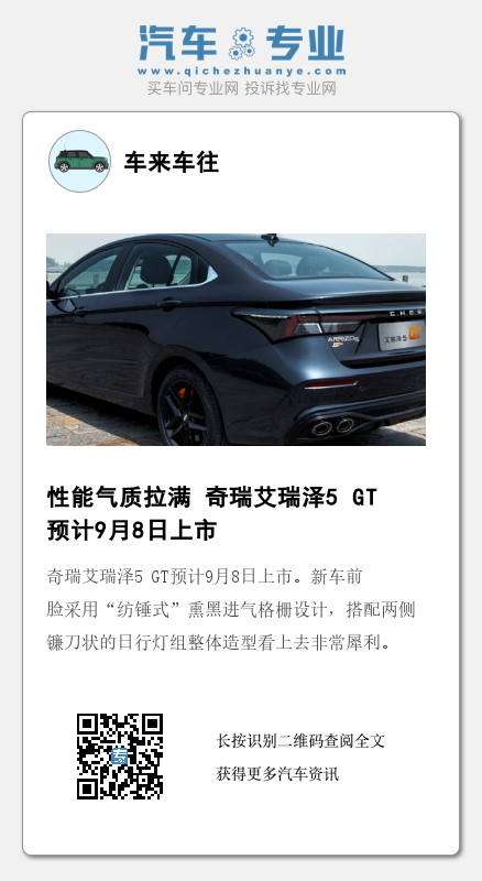 日前,网通社从官方获悉,奇瑞艾瑞泽5 GT预计9月8日上市。新车前脸最醒目的莫过于来源于先锋建筑美学的X格栅造型,搭配镰刀状日行灯组及银色/红色搭配的GT标识,凸显艾瑞泽5 GT运动属性。