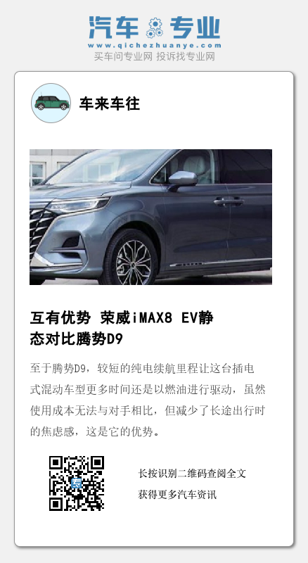 至于腾势D9,较短的纯电续航里程让这台插电式混动车型更多时间还是以燃油进行驱动,虽然使用成本无法与对手相比,但减少了长途出行时的焦虑感,这是它的优势。此外,如果能够接受其较大的块头所带来的一些不便,那有着更充裕的车内空间自然是一大利好。(图/文 汽车之家 周楚然)