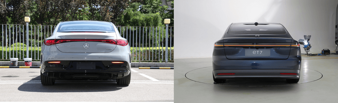 车尾部分,EQE的车尾设计基本和EQS一样,无论是贯穿式尾灯的设计还是“小鸭尾”,以及底部的扩散器都和EQS如出一辙,EQE的后备箱开启采用了传统三厢轿车的模式。蔚来ET7贯穿式的尾灯更细腻一些,拉伸了车尾的横向视觉感,让车尾看上去更加宽大,ET7后备箱开启同样采用了传统三厢轿车的模式。