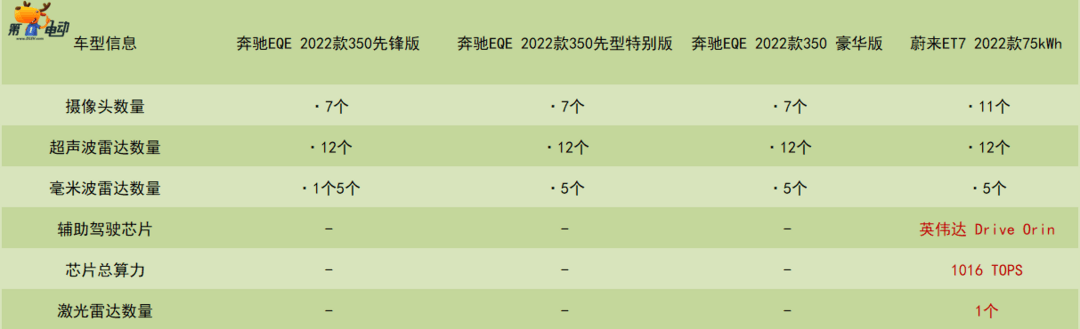 奔驰EQE配备7个摄像头、12个超声波雷达和5个毫米波雷达;蔚来ET7配备11个摄像头、12个超声波雷达、5个毫米波雷达和1个激光雷达,并且为了实现高阶的自动驾驶功能,蔚来ET7使用了英伟达 Drive Orin芯片,总算为1016 TOPS。