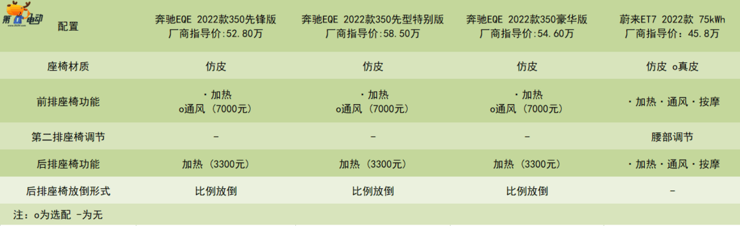 蔚来ES7简约舒适的座椅、环抱式扶手、飞航头枕、前后排静音玻璃、前后排座椅加热、通风、按摩和创新的后排Air Cushion背部舒缓系统等越级配备,全系标配。而奔驰EQE的前排座椅通风需要花费7000块钱选装,后排的座椅加热需要3300元选装,并且全系没有座椅按摩功能!