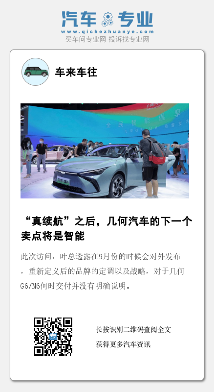 此次访问,叶总透露在9月份的时候会对外发布,重新定义后的品牌的定调以及战略,对于几何G6/M6何时交付并没有明确说明。