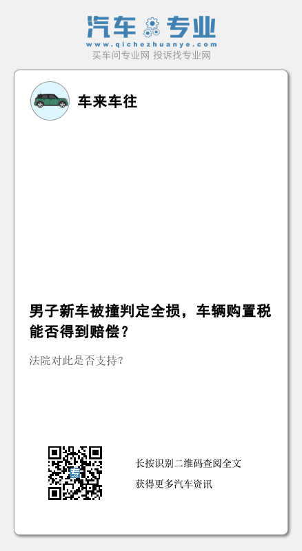 近日,重庆市江津区人民法院审理了一起机动车交通事故责任纠纷案。新车在事故中被撞损严重,车主不仅要求保险公司按全损赔偿车辆损失,还要求赔偿车辆购置税。法院对此是否支持?一起来看看吧!
