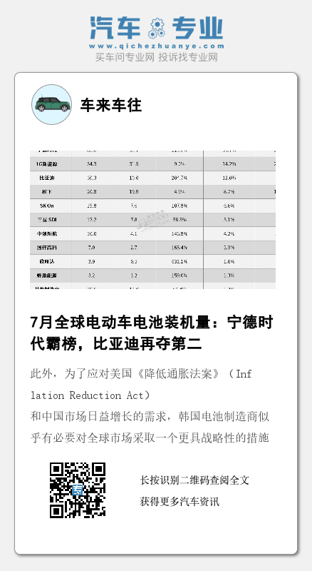 9月5日,韩国市场研究机构SNE Research公布的数据显示,2022年7月,全球电动车电池装机量达39.7 GWh,同比增长82.6%,连续25个月保持稳定增长。其中,宁德时代依旧在榜单中强势领跑,而比亚迪继4月和5月后,第三次从LG新能源手中夺得第二的宝座。