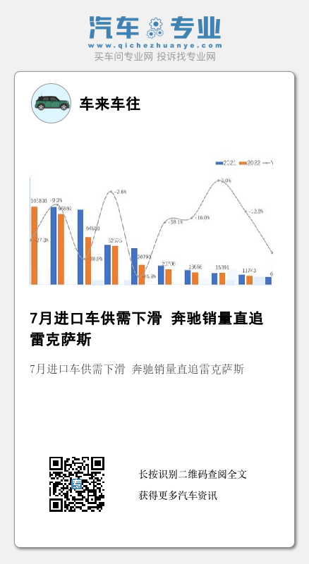 在进口车供给方面,今年1-7月我国共进口汽车51.7万辆,同比下降16.0%;进口金额为2100.1亿元,同比下降2.7%,不过进口金额降幅明显低于进口数量降幅,这也从侧面印证了进口车单价的上涨。